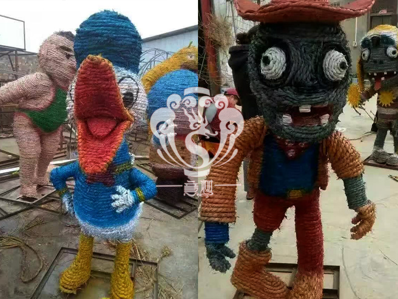 稻草人藝術(shù),不僅充分利用的稻草秸稈制作出各種有趣的形象,與此同時還能減少秸稈的焚燒,為我們的藍(lán)天白云,子孫后代做一份貢獻(xiàn)!現(xiàn)在的精致稻草人藝術(shù)通常是由專業(yè)美術(shù)老師的造型放樣,然后由焊工師傅焊接出立體造型造型,然后以稻草或者稻草繩為材料編捆制作而成。