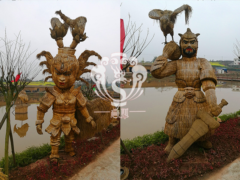現(xiàn)在的精致稻草人藝術(shù)通常是由專業(yè)美術(shù)老師的造型放樣,然后由焊工師傅焊接出立體造型造型,然后以稻草或者稻草繩為材料編捆制作而成。