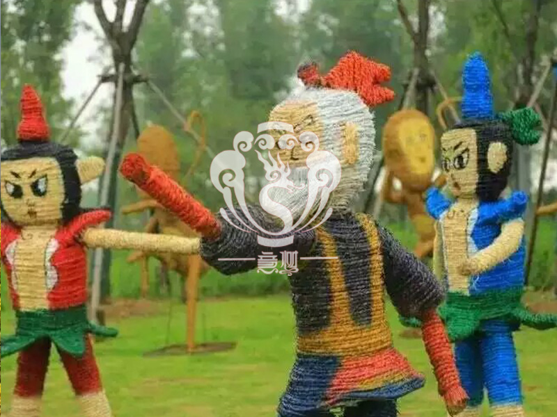 現(xiàn)在的精致稻草人藝術(shù)通常是由專業(yè)美術(shù)老師的造型放樣,然后由焊工師傅焊接出立體造型造型,然后以稻草或者稻草繩為材料編捆制作而成。