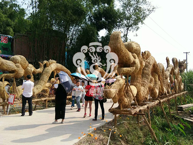 現(xiàn)在的精致稻草人藝術通常是由專業(yè)美術老師的造型放樣,然后由焊工師傅焊接出立體造型造型,然后以稻草或者稻草繩為材料編捆制作而成。
