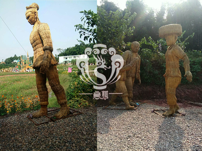 現(xiàn)在的精致稻草人藝術(shù)通常是由專(zhuān)業(yè)美術(shù)老師的造型放樣,然后由焊工師傅焊接出立體造型造型,然后以稻草或者稻草繩為材料編捆制作而成。