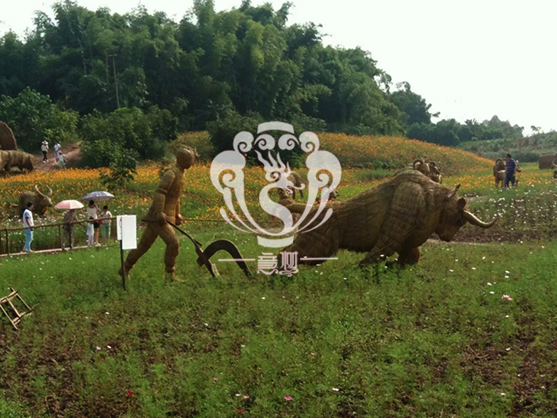 現在的精致稻草人藝術通常是由專業(yè)美術老師的造型放樣,然后由焊工師傅焊接出立體造型造型,然后以稻草或者稻草繩為材料編捆制作而成。