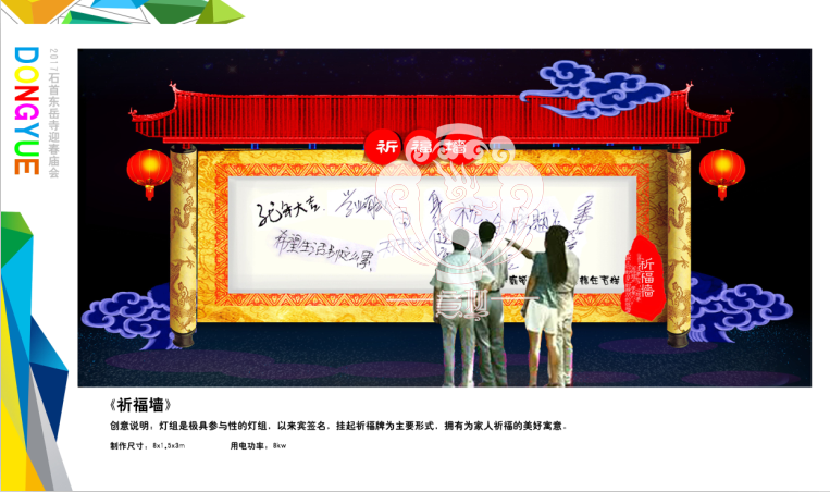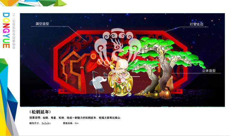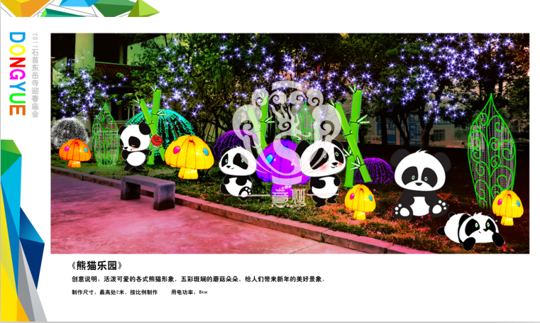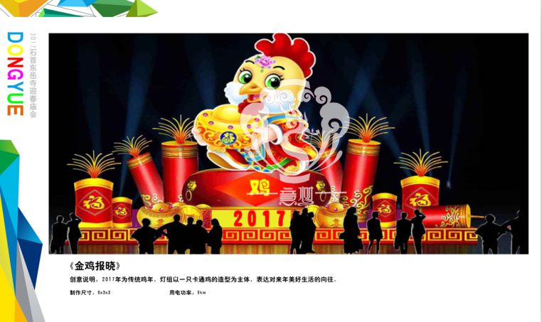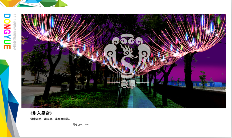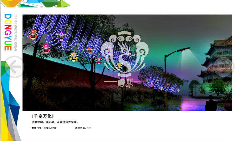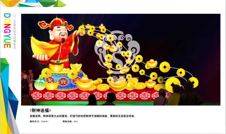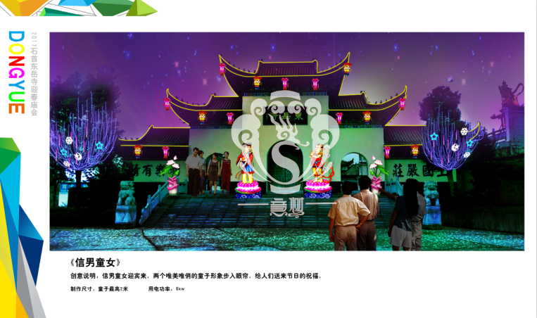 滿懷喜悅,深感榮幸。自貢市意樹文化傳播有限公司通過對湖北荊州石首東岳寺的實地考察,和我們的不懈努力,《湖北荊州石首東岳寺首屆迎春燈會方案》設(shè)計工作圓滿完成。我們結(jié)合東岳寺特色及氛圍營造亮化區(qū)域地形地貌,緊抓“歡慶佳節(jié)”的設(shè)計主題,把迎春燈會精心打造成2017年迎春的亮點,獻(xiàn)上盛大的視覺歡樂盛宴!
