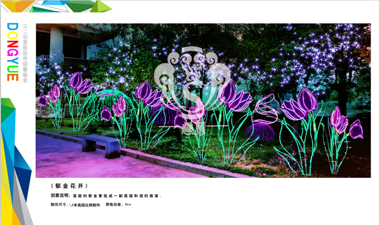 本次設(shè)計方案形式新穎、亮點突出、格調(diào)高雅,與“迎春、禮佛”的主題環(huán)環(huán)相扣,喜慶的節(jié)日氛圍在這交相輝映的盛世燈組中得到體現(xiàn),讓整個東岳寺充滿著舞動心弦的魅力。透過本次高品位氛圍體會到時代發(fā)展為人們帶來了更新、更加美好的幸福生活。