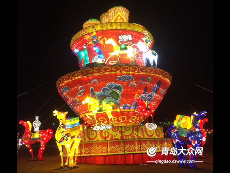 今年的賞燈節(jié)以“盛世中國(guó)夢(mèng),多彩絲路情”為主題,以張騫出使西域、鄭和下西洋等歷史事件為主線,用彩燈的藝術(shù)形式展現(xiàn)“絲綢之路經(jīng)濟(jì)帶”、“二十一世紀(jì)海上絲綢之路”沿線各國(guó)的建筑藝術(shù)、商業(yè)藝術(shù)、人文藝術(shù)。 入口處的“好客山東”燈組結(jié)合景區(qū)原有主題綠雕,以曲阜杏壇為背景,傳達(dá)出“有朋自遠(yuǎn)方來(lái),不亦樂乎”的美好寓意,歡迎八方游客的到來(lái)。地池水面上極具中國(guó)風(fēng)的超大型燈景“盛世中華”,以巨大的鏤空燈籠為主體,配以鮮艷的花朵和四條鯉魚,造型精致,具有極強(qiáng)的視覺沖擊力,讓人流連忘返?!皻g樂影像”燈組利用投影儀和地面彩燈,讓游客可以參與互動(dòng),吸引了不少觀賞者,尤其受孩子們的歡迎。市民游客紛紛表示,今年的燈組新穎、好看又富有意義,特別值得一看。