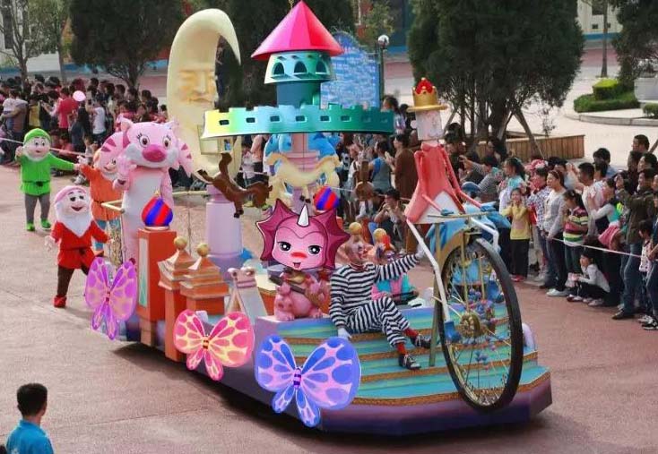 《夢(mèng)游仙境》長(zhǎng)15米高6米寬6米玻璃鋼彩繪花車。城堡是孩子們對(duì)童話世界幻想和向往,月亮城堡里呈現(xiàn)出小動(dòng)物們歡樂(lè)玩耍的場(chǎng)景,旋轉(zhuǎn)木馬,小動(dòng)物們彈琴歌唱,帶動(dòng)著游客歡快喜悅的心情。