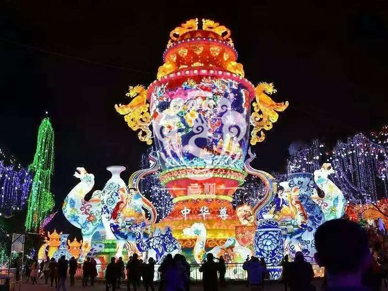進入漢代后,是銅燈制作的鼎盛時期?!段骶╇s記》載:“漢高祖入咸陽宮,秦有青玉五枝燈,高七尺五寸,下作蟠螭,口銜燈,燃則鱗甲皆動,煥炳列星盈盈。”又記:“長安巧工丁緩,作恒滿燈,九龍五鳳,雜以芙蓉蓮藕之奇?!焙颖睗M城西漢中山靖王妻竇綰墓中出土的“長信宮燈”,塑造出一個優(yōu)美的仕女形象,左手托燈,右手提燈罩,以手袖為虹管,處理得十分自然。燈體成圓形,有兩塊半圓形的罩板,可以任意調(diào)節(jié)光照的方向,既適應(yīng)實用的要求,也符合科學(xué)的原理,即可作燈又可作為觀賞的陳設(shè)品。這種實用與美觀的統(tǒng)一,正體現(xiàn)了卓越的設(shè)計匠心和藝術(shù)構(gòu)思。由此可見,早在燈節(jié)風(fēng)俗出現(xiàn)之前就有了古代花燈光源的油燭生產(chǎn)技術(shù),有了花燈造型的制作工藝,有了花燈藝術(shù)的能工巧匠。日后“漢家以望日祀太一,以昏時到期,今夜游觀燈”,形成了中國民族兩千多年的傳統(tǒng)習(xí)俗。花燈藝術(shù)在這種習(xí)俗的社會條件下得以不斷演進、發(fā)展。